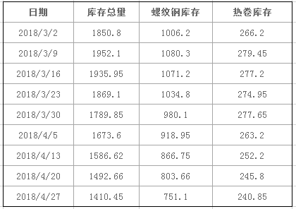 據(jù)中鋼網(wǎng)數(shù)據(jù)顯示,4月27日全國社會庫存總量為1410.45萬噸,周環(huán)比下降82.21萬噸,與今年以來的峰值相比下降541.65萬噸左右,處于持續(xù)下降狀態(tài)。尤其是螺紋鋼庫存連續(xù)5周降幅都在50萬噸以上,顯示下游需求有超季節(jié)性的表現(xiàn)。不過仍需注意的是,一季度全國平均日產(chǎn)粗鋼235.72萬噸,是歷史同期最高值,4月上旬重點(diǎn)鋼企粗鋼日均187.6萬噸,旬環(huán)比增長5.05%,鋼產(chǎn)量仍然處于上升通道,對市場整體供應(yīng)仍將形成階段性的抑制。