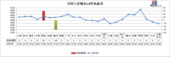 冷軋板卷:9月4日,全國24個主要城市1.0mm冷卷均價4681元/噸,較上個交易日持平?;久婵?,冷軋下游需求上升是拉動最近價格上漲的最強(qiáng)因素,下游制造業(yè)訂單增加,原材料消化明顯增加,帶動鋼廠直發(fā)終端訂單轉(zhuǎn)好,市場投放相應(yīng)減少,對價格有一定的支撐。綜合來看,下周國內(nèi)冷軋價格震蕩上行為主。
