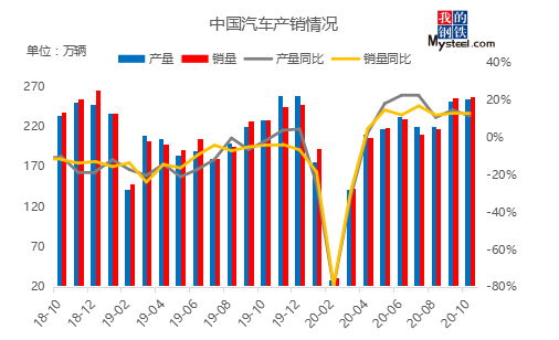 11月,汽車產(chǎn)銷分別完成284.7萬輛和277.0萬輛,環(huán)比分別增長11.5%和7.6%,同比分別增長9.6%和12.6%。截至本月,汽車產(chǎn)銷已連續(xù)8個月呈現(xiàn)增長,其中銷量已連續(xù)7個月增速保持在10%以上。臨近年末需求加速釋放,隨著各地利好政策延續(xù),基建帶動工程車等需求回升,預計12月汽車銷量持續(xù)向好,帶動用鋼需求。