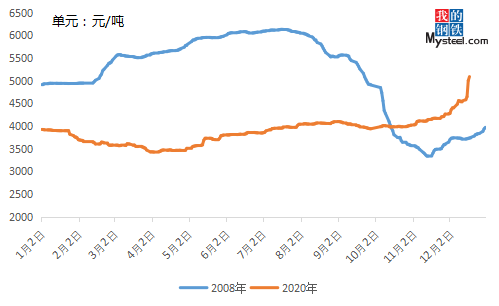 很多同行業(yè)的客戶也是表示從業(yè)這么多年,對于近期價格的快速拉漲也有點措手不及,那么為何在12月份市場還能有如此漲勢呢?我們認為和2008年的漲勢有異曲同工之處,但也存在今年的不同點就是有需求端的支撐。接下來,我們來細分看到底有哪些方面的因素來共同助推價格的大幅上漲。